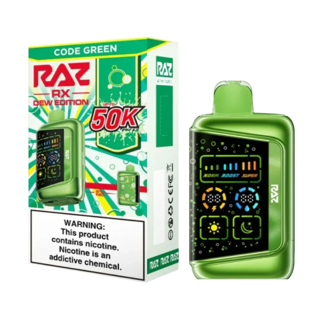 Flavor Profile: Code Green is the flagship of RAZ RX 50K Dew Edition. It is an authentic flavor of the classic Citrus Soda (Mountain Dew style).